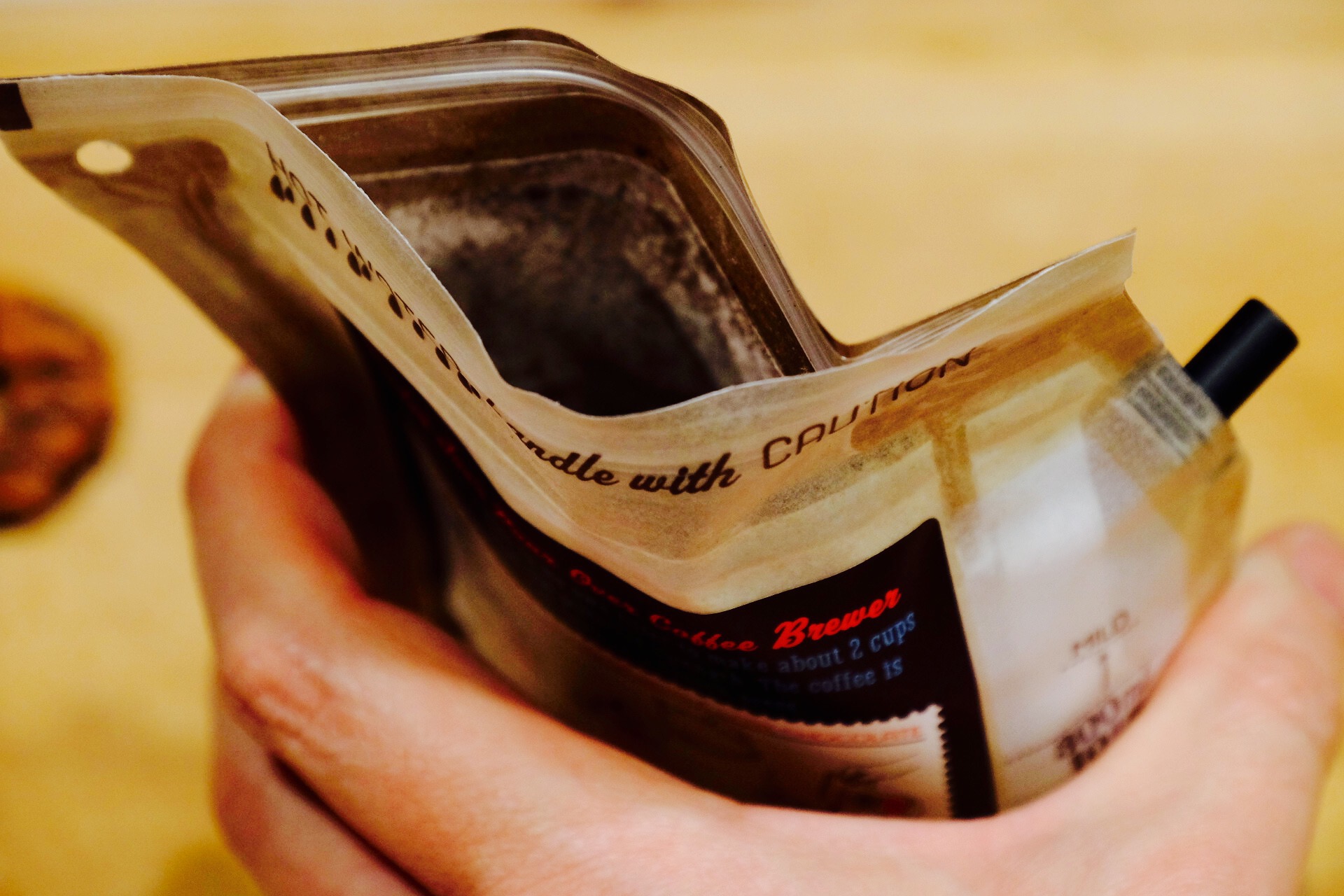 The ergonomics are a little odd here, though. The top doesn’t open wide, which meant I had to use my left hand to stabilize the package and also keep it open enough to pour hot water into. I’m guessing that if you have one of those slender-necked teapots it’s easier; I spilled and burned my fingers a little. I also couldn’t see too well into the package, and soaked only one side of the coffee grounds, which goes against the point of it being a pour-over. A second try was more successful—I poured enough in to expand the base and give it more stability before pouring the rest.