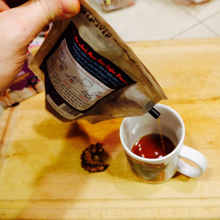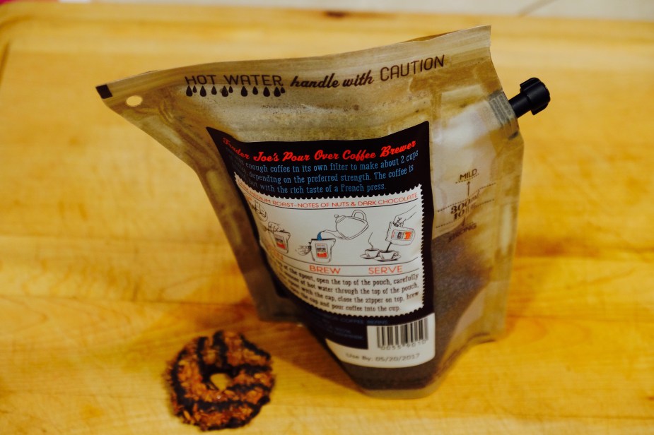 When I saw this on a design blog last week, I knew I had to give it a try. Trader Joe’s sells a self-contained pour-over coffee with very clever packaging. The coffee is stored in a bladder inside the package, which expands to rest upright while the coffee brews. All you do is provide the hot water.
