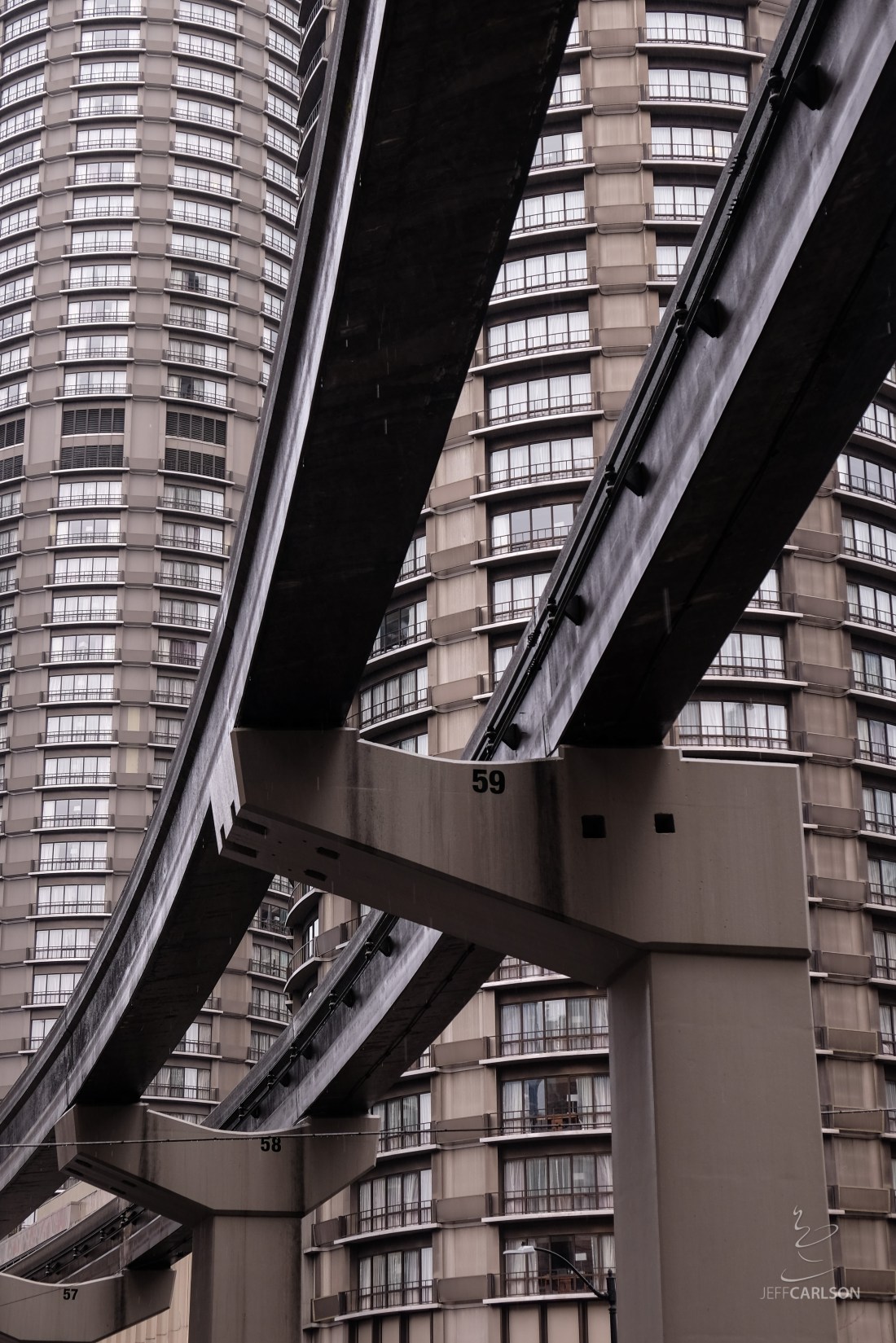 Looking through the monorail tracks to the Westin Hotel, downtown Seattle. (Click to view it larger at Flickr.)