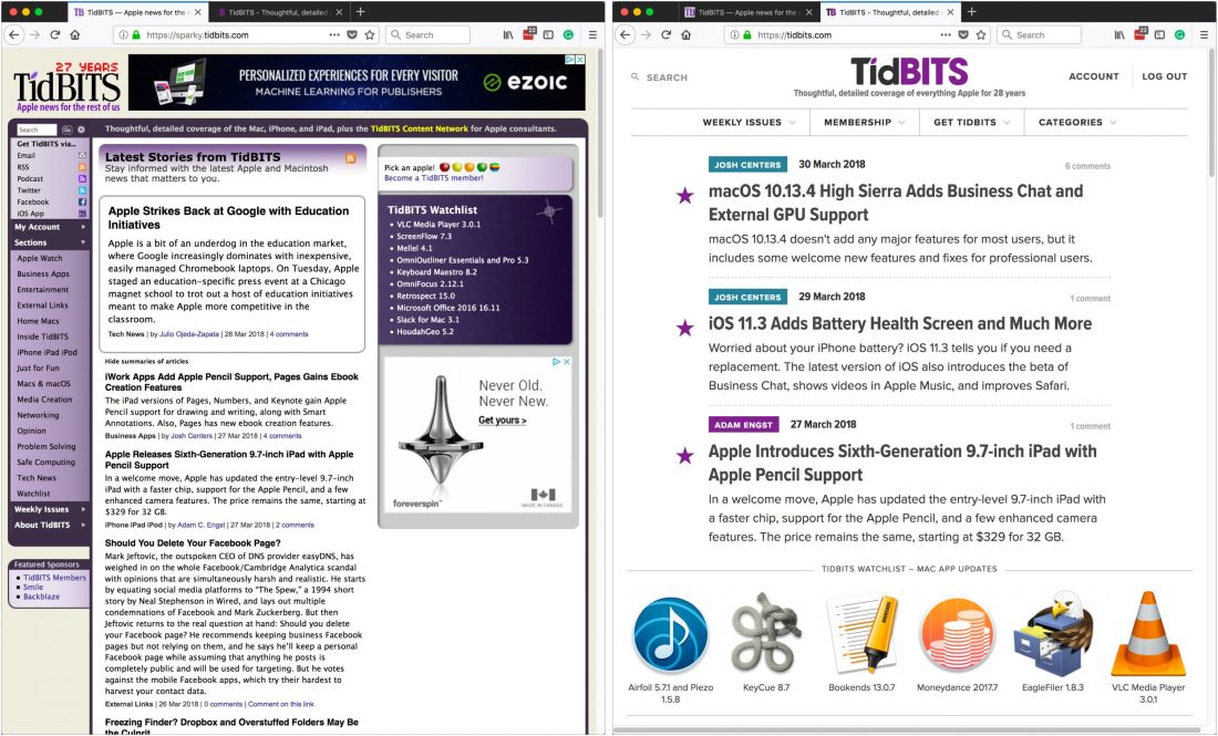 Now, the site is clean and modern and uncluttered and FAST. And responsive: load the site on an iPhone and switch between portrait and landscape orientations, for instance. Publisher Adam Engst elaborates on what’s new and different in Everything You Need to Know about the TidBITS 2018 Infrastructure.