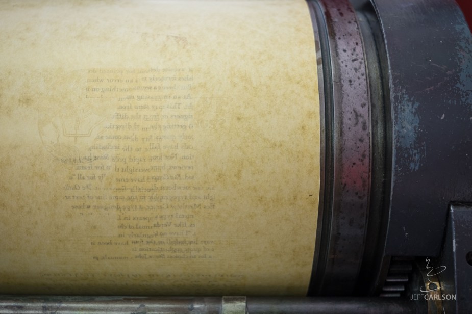 The drawsheet, on which each sheet of paper is affixed as it’s being printed, retains the ghost of the page after many impressions.