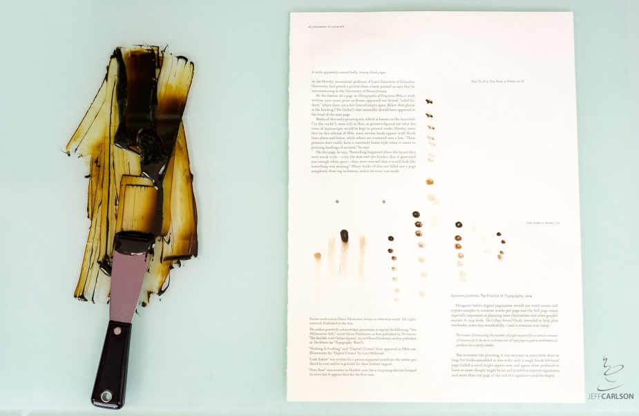 Ink is mixed on a glass table and then dotted onto a sample page from the book to arrive at the right color.