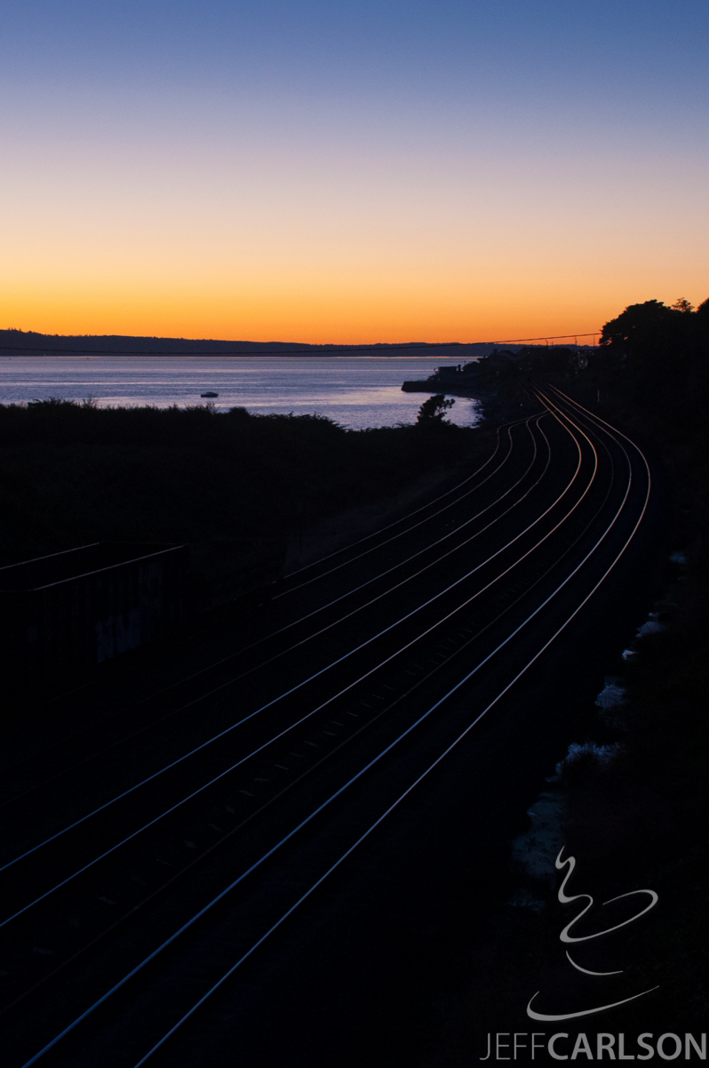 Sunset reflected off railroad tracks, Richmond Beach, WA.